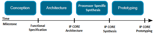 Prototyping – Includes synthesis of processor specific components, unit testing, and finally prototyping integration tests, in order to generate a physical prototype of the IP-core.